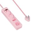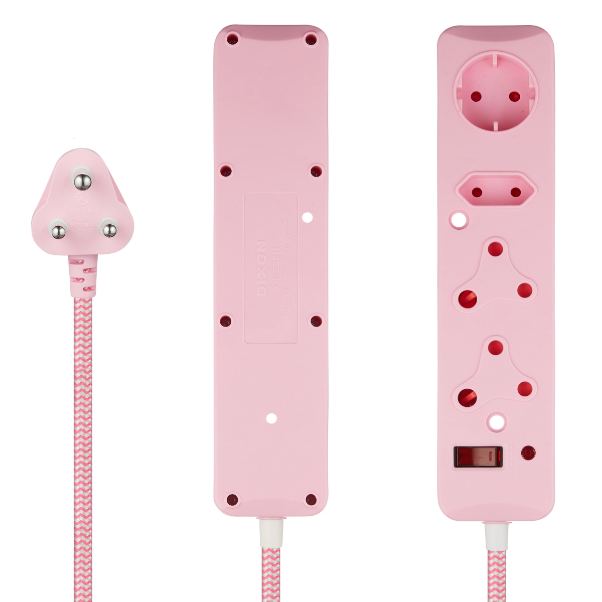 4-way multiplug with overload protection and safety shutters. 16A rating and surge protection max on live and neutral of 6000A.